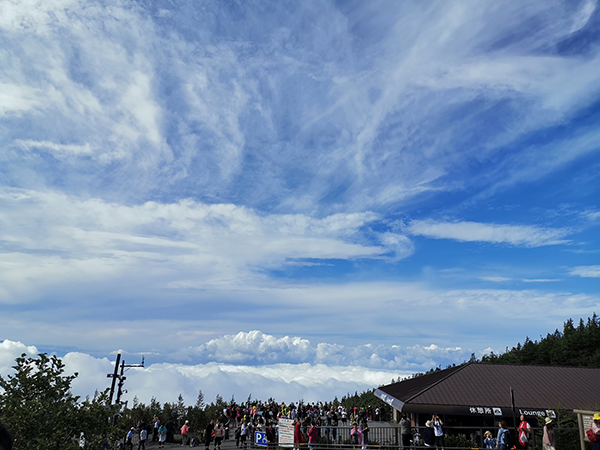 富士山身后的云海,人們?yōu)橹利惖奶炜胀qv腳步。
