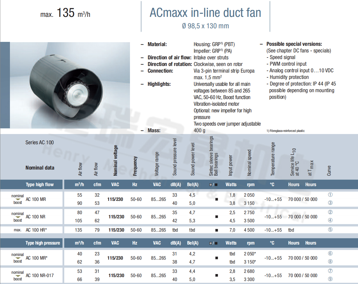 Aci4420HH風(fēng)量:175m³/h  電壓:230v 電流:5.3A  功率:4.6W  轉(zhuǎn)速:3300r/min