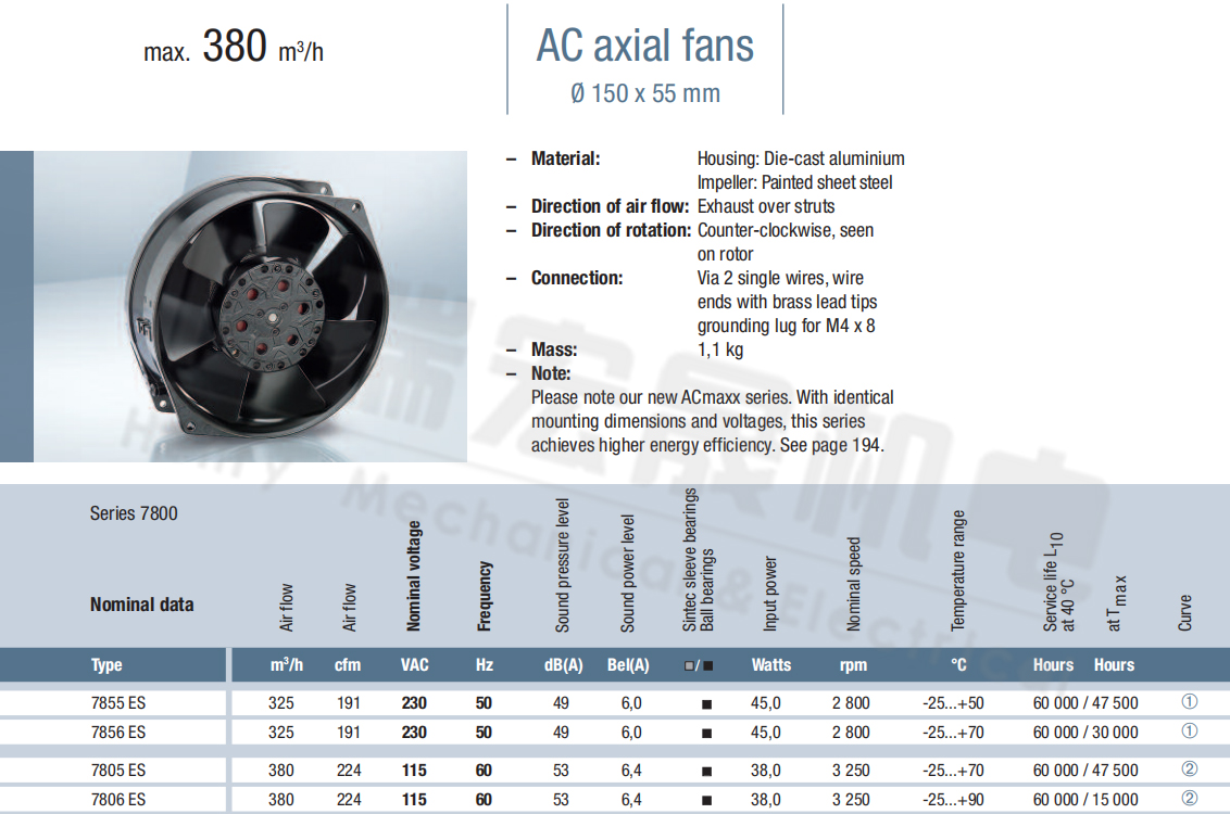7856ES風(fēng)量:325m³/h 電壓:230v 電流:6.0A 功率:45W 轉(zhuǎn)速:2800r/min